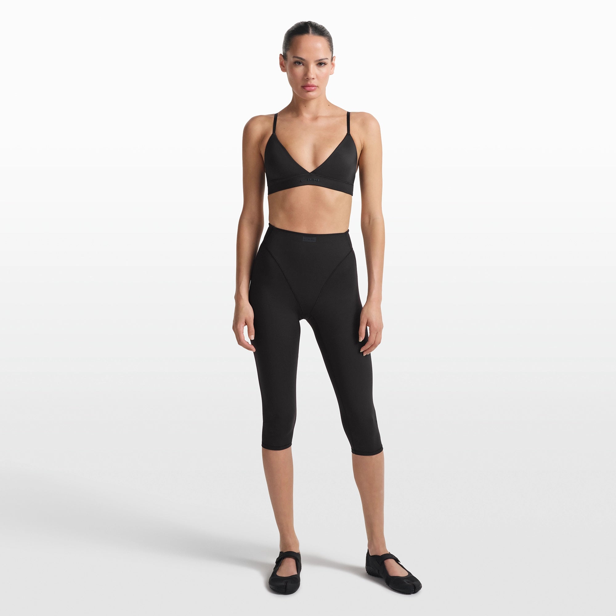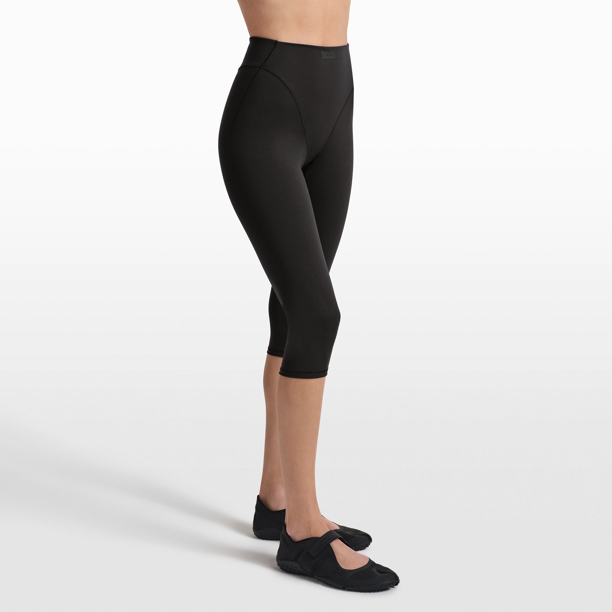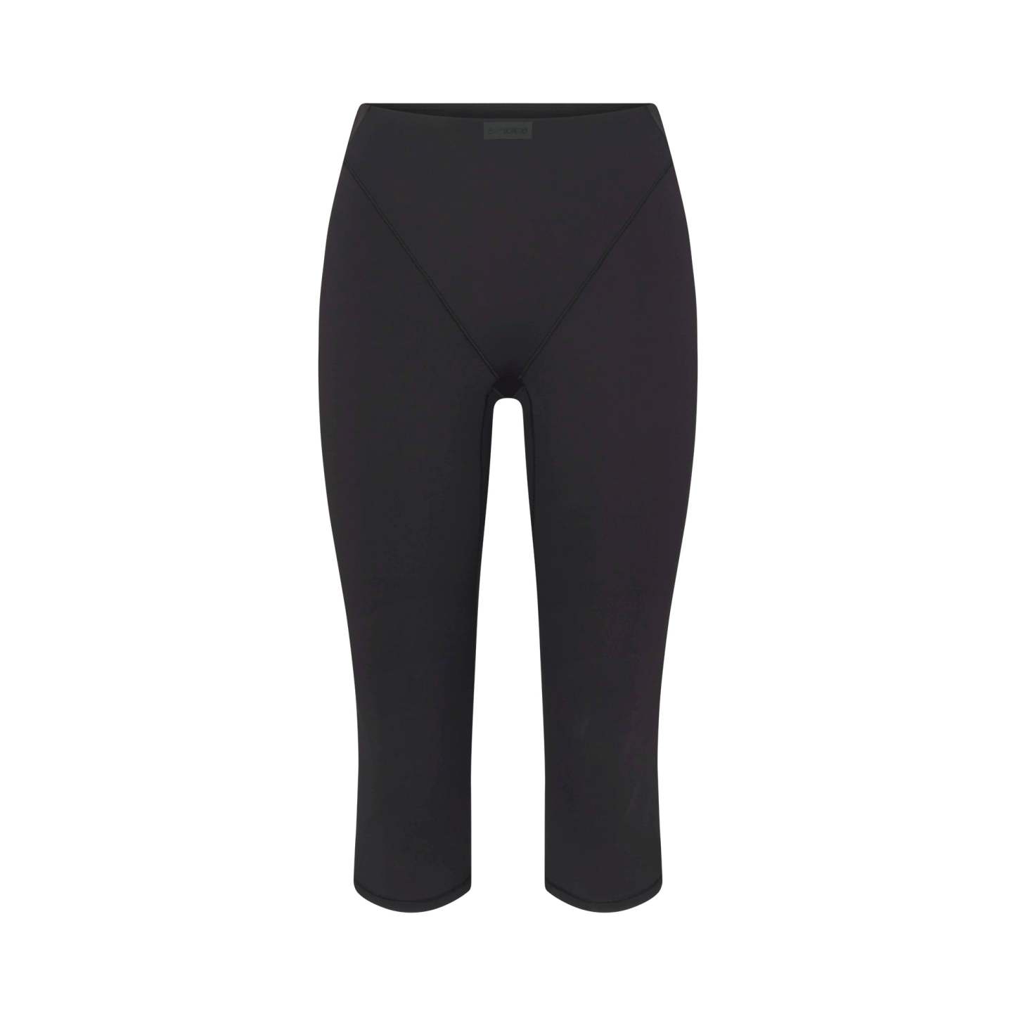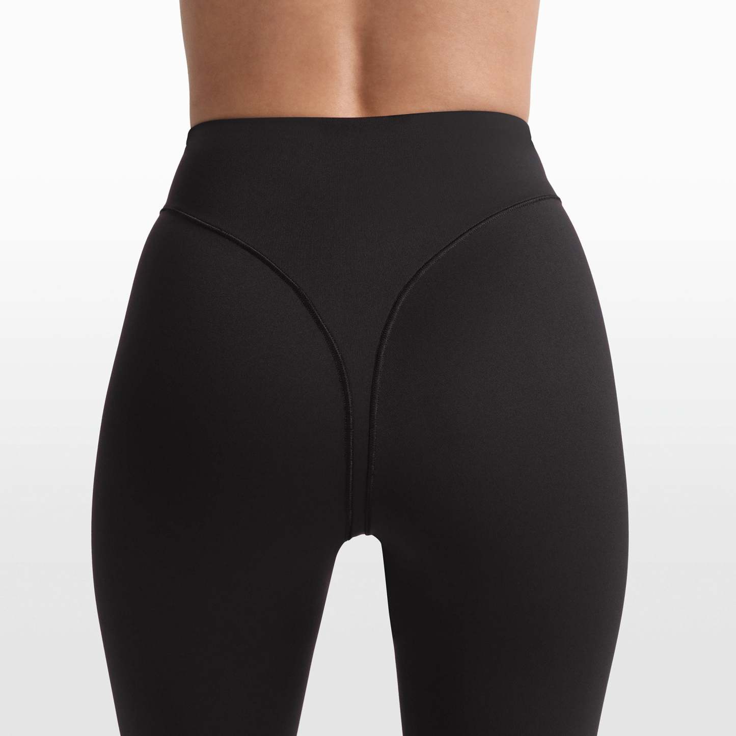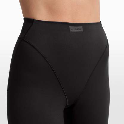 High-waisted, Double layered v-panel, Side dart detail, Thong back detail, Cotton gusset, Fits tight to body, Crop length, Inseam: 17"