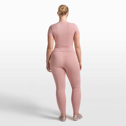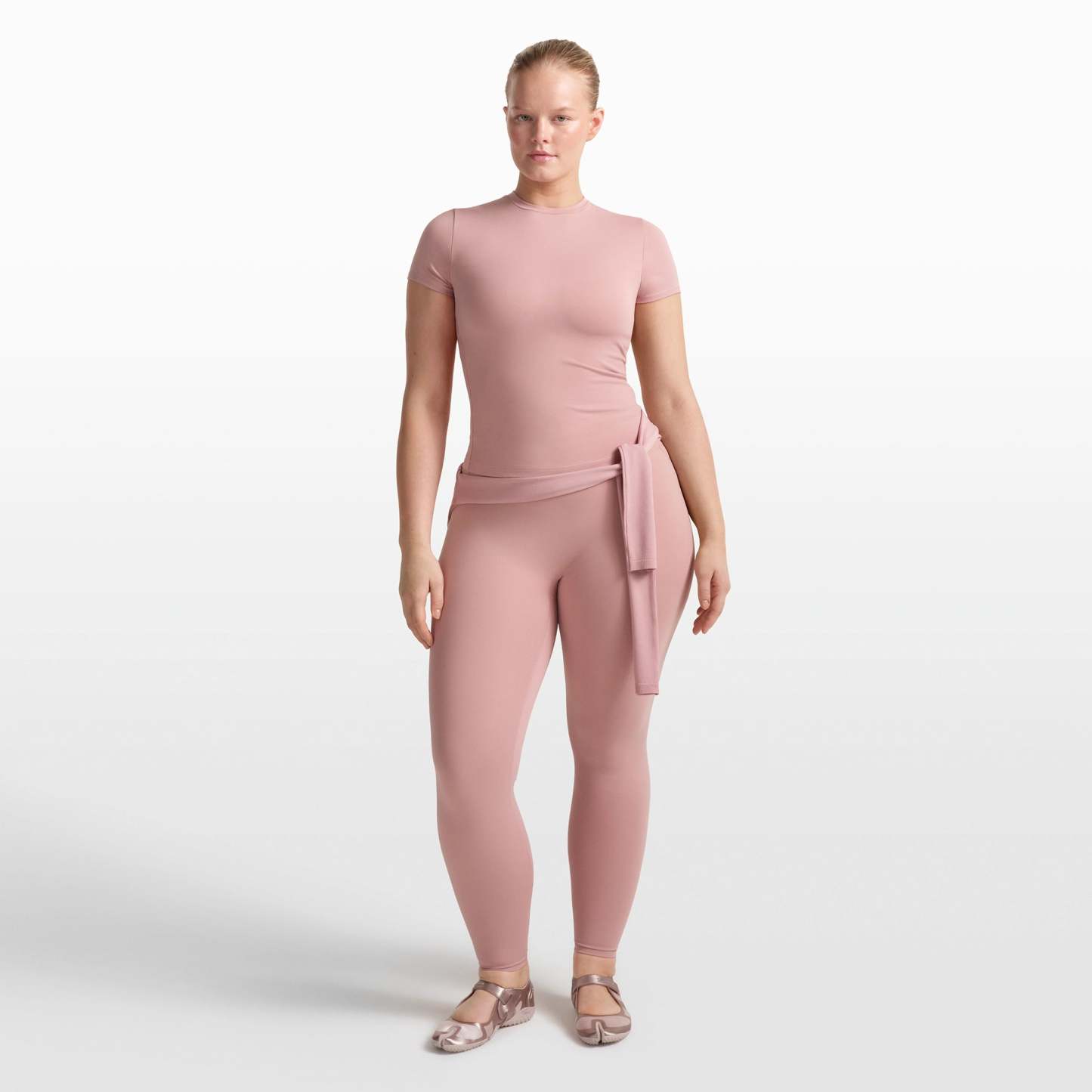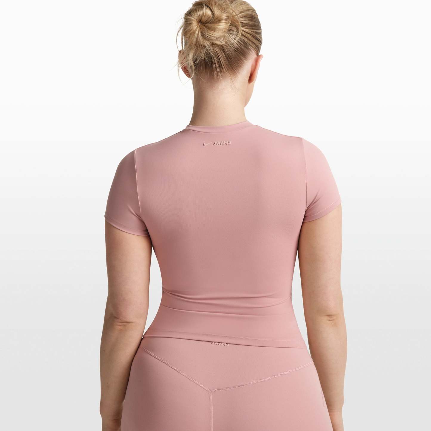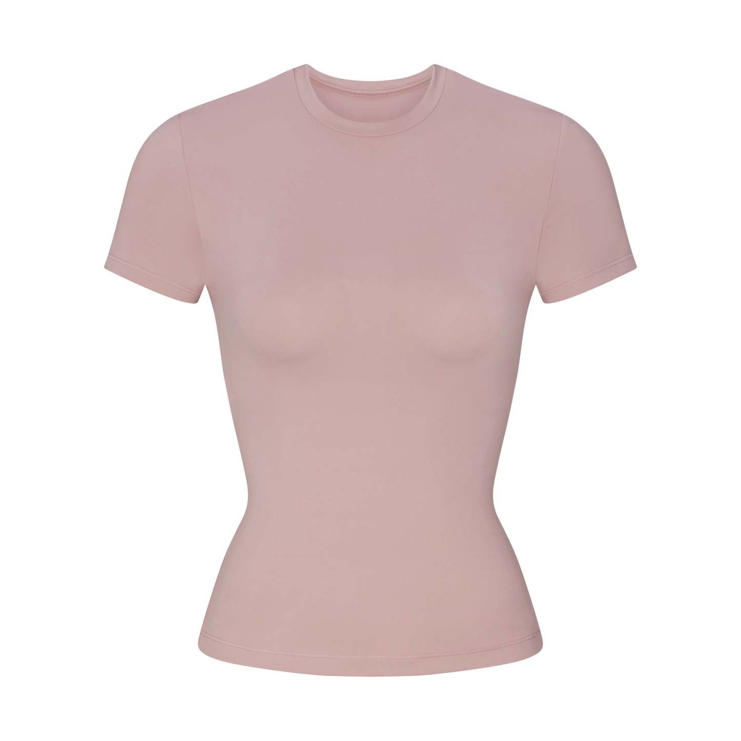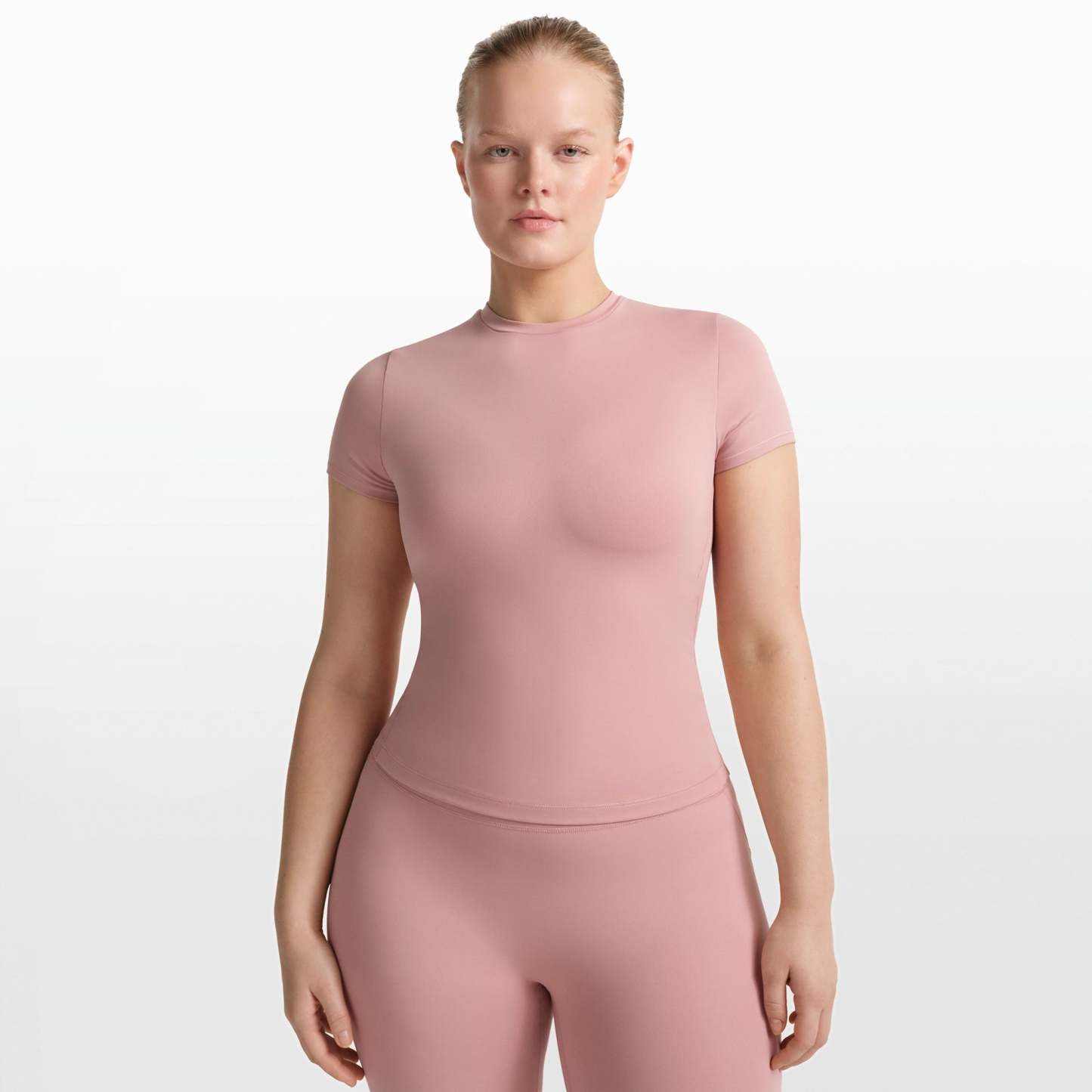 Crew neck, Short sleeves, Built in spacer pad with underbust elastic, Smooth back with no visible bra lines, Fits tight to body, Length: 22"